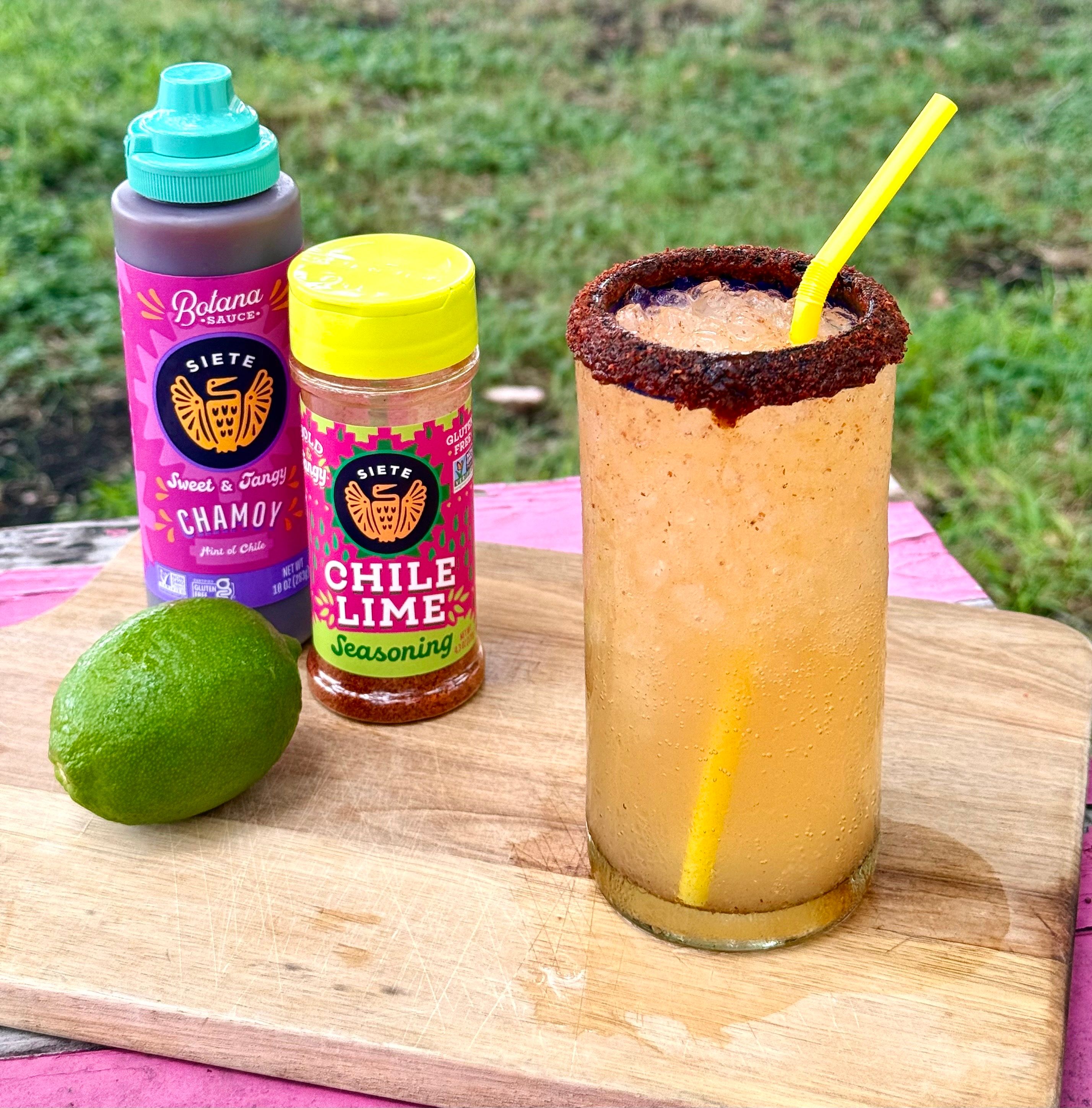 Place all ingredients, except the Chamoy Botana Sauce, in a blender and blend until smooth -